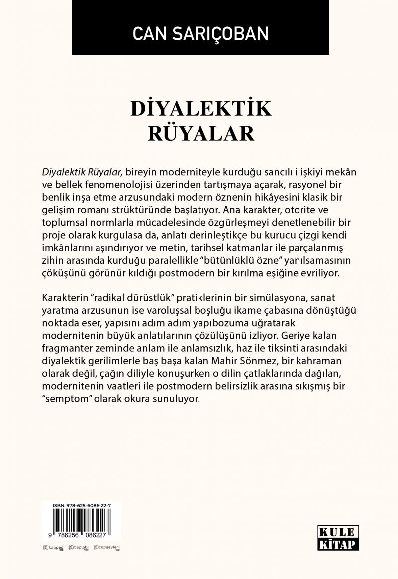 Diyalektik Rüyalar, bireyin moderniteyle kurduğu sancılı ilişkiyi mekân ve bellek fenomenolojisi üzerinden tartışmaya açarak, rasyonel bir benlik inşa etme arzusundaki modern öznenin hikâyesini klasik bir gelişim romanı strüktüründe başlatıyor. Ana karakter, otorite ve toplumsal normlarla mücadelesinde özgürleşmeyi denetlenebilir bir proje olarak kurgulasa da, anlatı derinleştikçe bu kurucu çizgi kendi imkânlarını aşındırıyor ve metin, tarihsel katmanlar ile parçalanmış zihin arasında kurduğu paralellikle “bütünlüklü özne” yanılsamasının çöküşünü görünür kıldığı postmodern bir kırılma eşiğine evriliyor.
