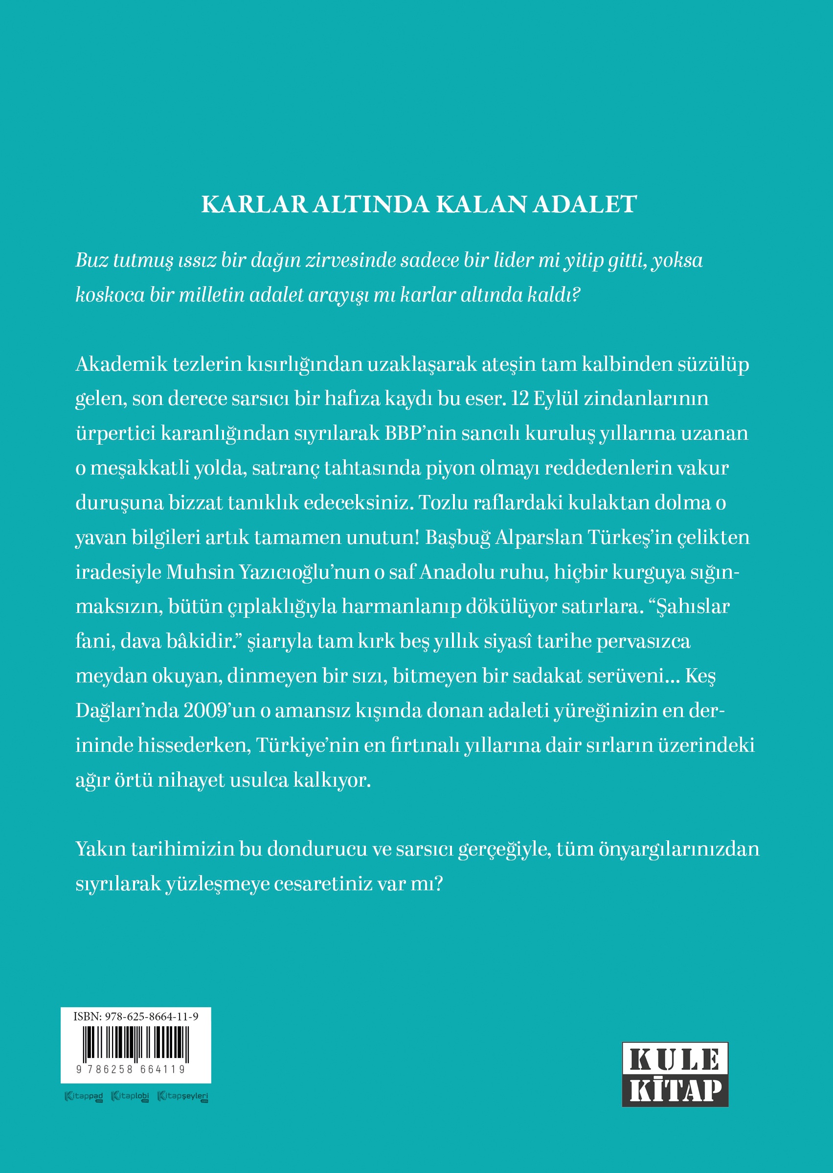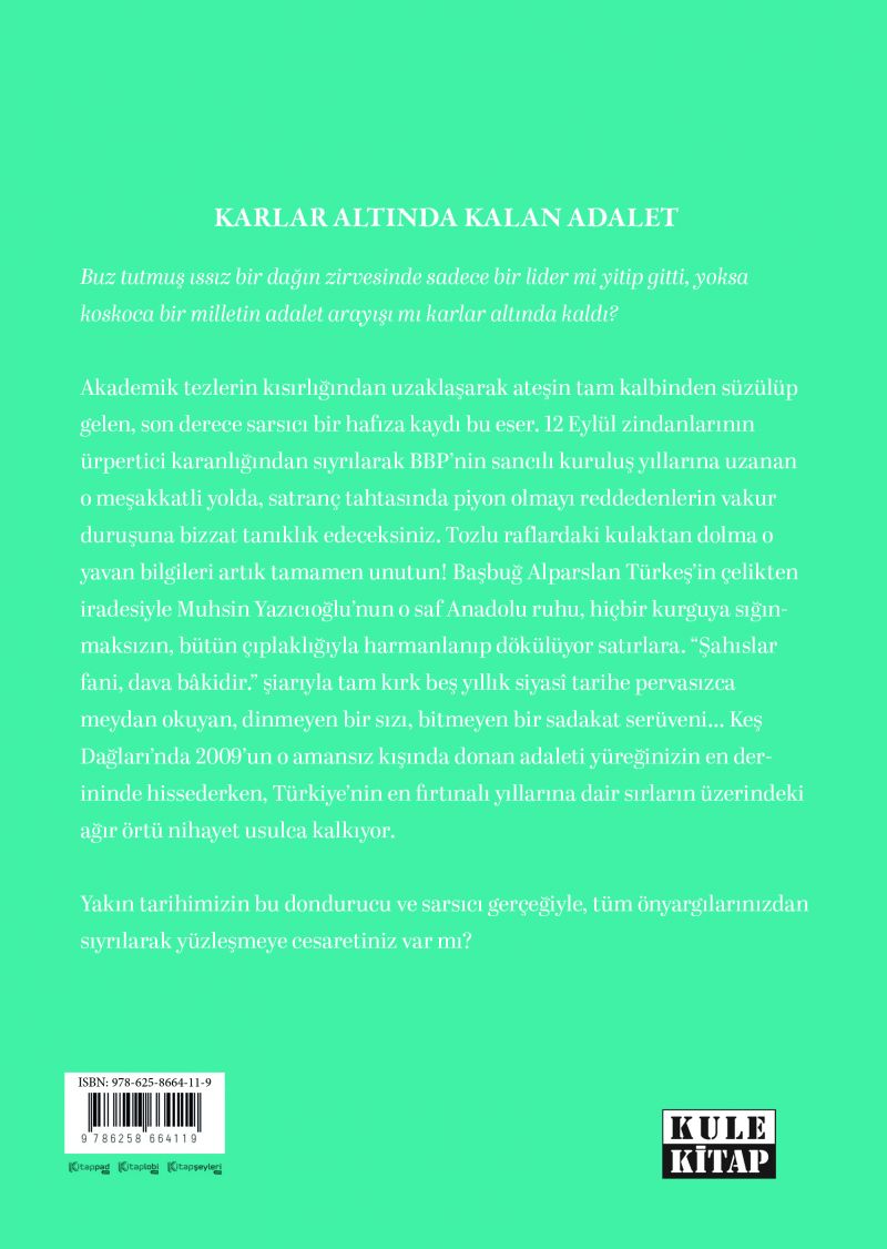 Akademik tezlerin kısırlığından uzaklaşarak ateşin tam kalbinden süzülüp gelen, son derece sarsıcı bir hafıza kaydı bu eser. 12 Eylül zindanlarının ürpertici karanlığından sıyrılarak BBP’nin sancılı kuruluş yıllarına uzanan o meşakkatli yolda, satranç tahtasında piyon olmayı reddedenlerin vakur duruşuna bizzat tanıklık edeceksiniz. Tozlu raflardaki kulaktan dolma o yavan bilgileri artık tamamen unutun! Başbuğ Alparslan Türkeş’in çelikten iradesiyle Muhsin Yazıcıoğlu’nun o saf Anadolu ruhu, hiçbir kurguya sığınmaksızın, bütün çıplaklığıyla harmanlanıp dökülüyor satırlara. "Şahıslar fani, dava bâkidir." şiarıyla tam kırk beş yıllık siyasî tarihe pervasızca meydan okuyan, dinmeyen bir sızı, bitmeyen bir sadakat serüveni... Keş Dağları’nda 2009'un o amansız kışında donan adaleti yüreğinizin en derininde hissederken, Türkiye'nin en fırtınalı yıllarına dair sırların üzerindeki ağır örtü nihayet usulca kalkıyor.